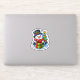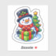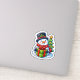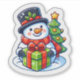 This delightful holiday sticker features a charming snowman wearing a top hat adorned with holly. It sits beside a decorated Christmas tree, holding a beautifully wrapped green gift, embodying the joyful spirit of the season.