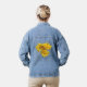 A cheerful denim jacket with vibrant yellow daisy flowers on the back.