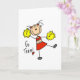 Cute cheerleading stick figure girl design greeting cards featuring a cheerleader wearing a red outfit and gold pom poms. Text reads "Go Team!". Can be customized with a name too!