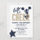 Let's Cheer! Cheerleading birthday party invitation in gold glitter and navy.