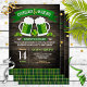 Fun "cheers and beers" St. Patarick's Day birthday party celebration invitations featuring a dark wood grain background, green and orange tartan, 4 leaf clovers, fun, whimsical fonts and two green beer steins toasting