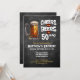A mix of rustic and midcentury modern style birthday invitation, with a dash of modern grunge. A "Cheers and Beers" theme with a big beer stein glass, and two toasting beer steins on the back side. The text is customizable.