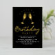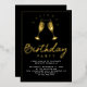 Black and gold birthday party invitations featuring two champagne glasses toasting and "birthday" in a brush script font. "Birthday party" text and the champagne glasses will appear in real metallic foil, while the event details are written in matte white text to be easily readable. Simple and fun adult birthday party invitations that can be changed to any age. Cheers!