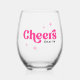 Stemless wine glass with black or custom colour text "Cheers" in a hot pink, retro style font and your custom name below to the right. Around are pink, retro stars.