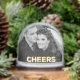 This is a fun and festive snow globe that is easy to customize with your own photos, name and date. One side of the snow globe is accented with your special photo and Cheers written in marquee lights; while the other side is decorated with the same photo or different photo, and names and date, (or your own special message if preferred). This makes a wonderful gift for the holidays, or the start of a new family tradition. If help is needed customizing this item, just contact us at prettyfancyinvites@gmail.com.