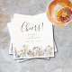 This Cheers Dusty Blue Watercolor Wildflowers Elegant Wedding Cocktail Napkin showcases delicate wildflowers in dusty blue, purple, and yellow on a white background, with modern typography and script calligraphy. It is fully customizable with the couple's names and hotel details The formal design and wording will add a touch of elegance to your wedding celebration.