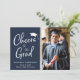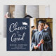Modern dark blue 2 photo graduation announcement card. The front features the graduate's photo, "Cheers to the Grad" in a modern white script, and a white illustration of grad cap. Easily personalize with the graduate's name and school, and add another photo on the back.