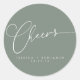 Cheers Minimalist White Script on Sage Green Background Custom Wedding Classic Round Sticker