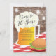 Cheers to 70 years birthday barbecue invitation featuring a beer mug & burger set on a rustic wood background with hanging mason jar lights