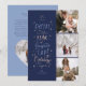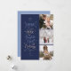 Cheers to the New year with this Dynamic and fun multi photo Holiday card. The Card text reads "Cheers to Another year of Laughter, Love, & Holiday Magic" Customize the Date, Family name, and paragraph of room on the back for a paragraph of text to share about your year. 3 Photos layout on front and a heart frame photo on back. Navy, and light blues and cream design.