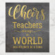 Teacher appreciation gift with elegant gold typography script "teachers change the world one student at a time" inspirational quote and cheers on blackboard background.