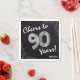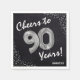 Black and gold 'Cheers to 90 Years" Birthday Party Napkins! Design features a rustic black chalkboard with a faux silver helum ninety balloon, faux silver confetti and name.