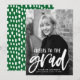Stylish, modern graduation announcements featuring the graduate's vertical photo with "Cheers to the grad" in a white, hand-lettered brush script. Personalize the front of the announcement by adding the graduate's name, school name, and graduation year. The photo graduation announcement reverses to display a green and white abstract dot pattern.