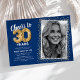 Celebrate the grand milestone of turning thirty with our elegant birthday party invitations. With a customizable trendy blue background, a personal photo spot, and golden accents, these invitations are sure to leave a lasting impression. The gold helium balloon details add a touch of magic, while the modern 30th birthday text template is effortlessly easy to personalize. Because style has no age limit!