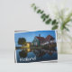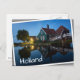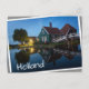 Photo postcard of a traditional wooden house used as a cheese farm in green paint with red tiles with reflection in the water at the start of the night at twilight in the Zaanse Schans museum in Holland with a white edge and the text 'Holland'. The image is a bit rotated, to create the effect of it laying loose.