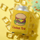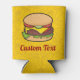 Cheeseburger cartoon illustration. Junk food outline icons yellow pattern background. Custom text on both sides.