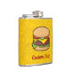 Cheeseburger cartoon illustration. Junk food outline icons yellow pattern background. Custom text.