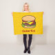 Cheeseburger cartoon illustration. Junk food outline icons yellow pattern background. Custom text.