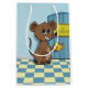 A cute mouse, holding a heart made of cheese, standing in front of a kitchen and mouse door. Say a cheesy I love you with heart-shaped cheese.