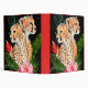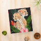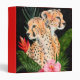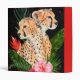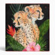 Cheetah Bouquet II by Annie Warren. Two cheetahs are framed by tropical leaves and greenery against a black background. | 164453Z