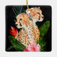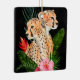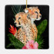 Cheetah Bouquet II by Annie Warren. Two cheetahs are framed by tropical leaves and greenery against a black background. | 164453Z