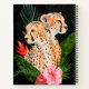 Cheetah Bouquet II by Annie Warren. Two cheetahs are framed by tropical leaves and greenery against a black background. | 164453Z