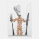 Chef box character with tall chef hat holding big knife and fork against a white background. Cooking and kitchen concept
