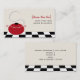 Un carte de visite de l'industrie alimentaire montrant une illustration devant une casserole à cuisine rouge avec de la vapeur s'échappant du couvercle assis sur une surface noire et blanche. Personnalisez le texte à l'avant et à l'arrière avec vos coordonnées.