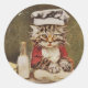 Cute kitty in gingham outfit and wearing a chef's hat kneads bread. Vintage trick photography c1914.