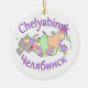 Colourful map ornament of the Russian Federation with Chelyabinsk city location marked with a flag. City name also in Russian - Челябинск. Unique Russia family or adoption or Christmas gift for families with children from Chelyabinsk. Designed by Hendrika of www.RedThreadMaps.com