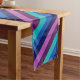 Un coureur de table de 16 po x 108 po avec un design motif coloré de bandes diagonales en turquoise cool, bleu océan, bleu marine, pourpre prune et lavande.
