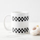 Chequered Checkers Black White Mug. Do you love Checkers? Are black and white your colours? Chequerboard games? Do checkers make you think of car racing? Emo, punk, grunge? Whatever, this is a mug for lovers of checkers. My favourite is the frosted mug but it's also available in a lot of styles from a white mug with two stripes of black and white checkers to a travel mug with black checks and the see through white becomes silver... to make it a silver and black chequered travel mug. Your choice on the right.