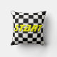 Chequered flag auto racing pattern zippered throw pillow. Square checked design with custom text and background colour. Customize to big or small size checks. Automotive speed racing theme design. Double sided print with yellow start and finish dynamic sports text. Cute home decor for racer, mechanic or taxi cab / car driver. Also cool decoration for themed restaurant diner.