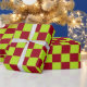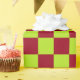 Abstract digital art of lime green and burgundy squares in a chequered formation.