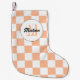 Chequered peach white geometric retro Monogram Christmas Stocking. Chequered squares geometric retro pattern Holiday gift. Cool retro chequered geometric square pattern. Vintage tile peach white modern chequered. Personalize with your custom initial and name.