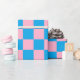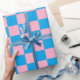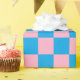 Abstract digital art of pink and turquoise squares in a chequered formation.