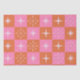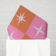 This is elegant chequered mid century modern atomic starbursts pattern on orange and pink chequerboard squares.