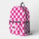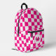 Chequered squares hot pink white geometry Monogram Printed Backpack. Cool fashion accessory bag for her. Cool retro chequered geometric square pattern. Vintage tile white and hot pink modern chequered. Create a unique and personalized backpack with a custom touch! Modern monogram with your initial and your name for that extra personal flair.