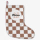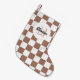 Chequered squares mocha brown white retro Monogram Christmas Stocking. Chequered squares geometric retro pattern Holiday gift. Cool retro chequered geometric square pattern. Personalize with your custom initial and name.