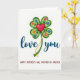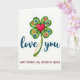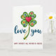 This card features a white background with a stylized four-leaf clover in layered green tones, giving the leaves a softly shaded, rounded look. In the centre sits a glossy red heart ❤️ that catches the eye like a tender promise held close. A thin yellow ribbon curls outward from the heart, suggesting a gentle connection that continues beyond distance. Small blossoms in pink, blue, and orange decorate each leaf, adding a caring, affectionate touch like flowers placed with quiet devotion 🌼. Beneath the clover, the words “love you” appear in deep teal, written in flowing lettering and centred under the artwork. Lower on the page, a second line of text reads “HAPPY MOTHER’S DAY, MOTHER IN HEAVEN” in clear red letters, spaced evenly and easy to read. The final detail is the way the yellow ribbon arcs to the side with a light curve, framed by the tiny flowers around the clover.