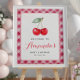 A cheerful cherry-themed baby shower welcome sign featuring two watercolor cherries framed by a pink gingham border. Personalize with the guest of honour’s name and event date. Perfect for greeting guests and tying your cherry party theme together.
