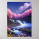 This digital art captures the serene beauty of a mountain river cascading down the hillside, dotted with stunning cherry blossom trees at the top. The waterfall's rush creates a symphony with nature's elements, while the vibrant hues of pink flora add to the charm of the picturesque setting. A perfect addition to any nature lover's collection, this poster captures the essence of natural beauty at its finest.