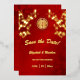 Red cherry blossoms and a real gold foil double happiness symbol on a shimmering red background. Save the date text in an elegant script. Matching Chinese wedding products available.