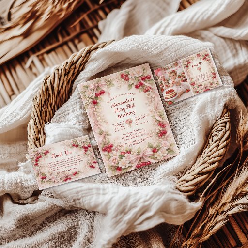 This blush strawberry garden collection features soft watercolor strawberries intertwined with delicate florals, creating a romantic vintage wreath aesthetic. Designed with a timeless, storybook feel, it’s perfect for celebrating a sweet first birthday with elegance and warmth. Ideal for strawberry-themed parties, garden celebrations, and classic floral styling, this design balances softness, charm, and refined detail for a memorable milestone.