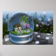 Inside a "snow globe" is a spring landscape with a cottage overshadowed by maple and cherry trees. The surrounding grassy field is filled with spring flowers, snapdragons and cornflowers in pastel colours. Roses and ivy climb the wall of the little house. The cherry tree is in full bloom, and instead of snow there are cherry blossoms swirling around in the globe and blanketing the grass.