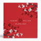 A modern classic chinese wedding design featuring an illustration of beautiful and elegant white cherry blossoms or sakura spring flowers on black branches with a centered simple double happiness symbol on a red background.