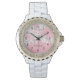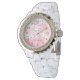 Pretty white cherry blossom branches on a pink sparkling background. Customize this girly luxury watch with your name.