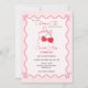 Designed with love and attention to detail, each invitation features a whimsical wavy pattern that adds a playful touch to the overall design. The combination of red cherries and pink bows creates a delightful contrast that captures the essence of fun and sweetness.
