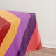 A 52” x 70” tablecloth featuring a colourful pattern motif of diagonal stripes in cherry red, melon pink, violet, plum purple, and banana yellow.