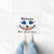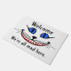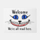 Doormat with image of Cheshire Cat from Alice in Wonderland with the words, "Welcome, we're all mad here".